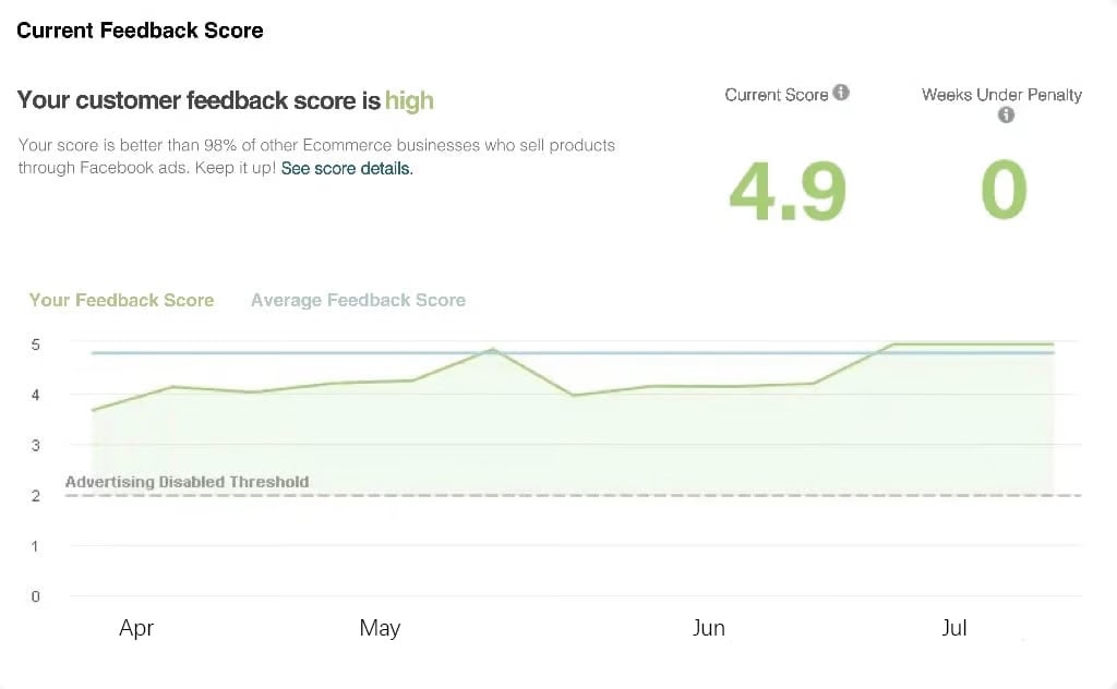 Our Facebook Official Customer Feedback Score Has Reached 4.9 out of 5. The score is better than 98% of other Ecommerce businesses who sell products through Facebook ads