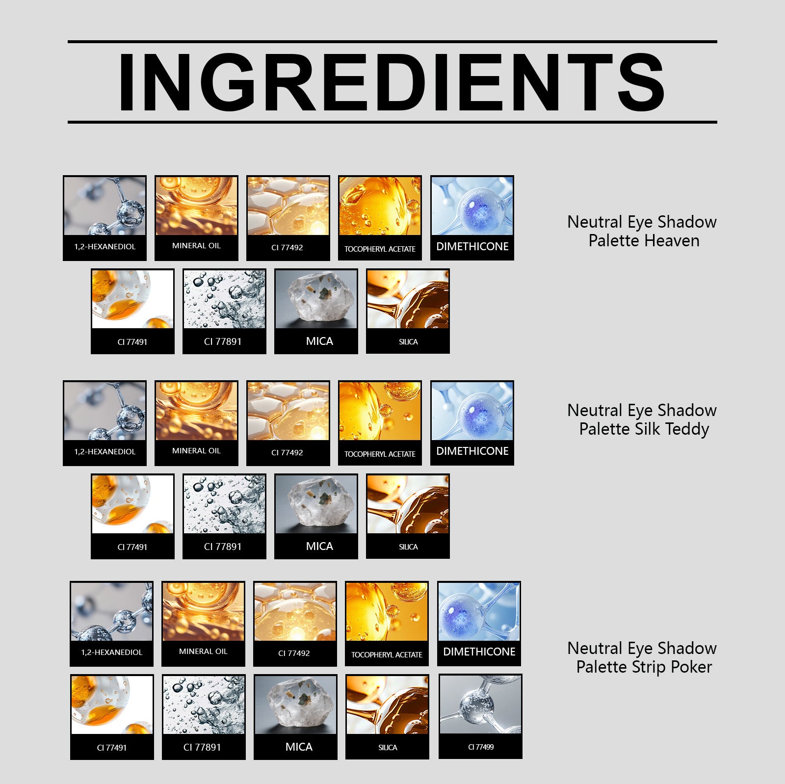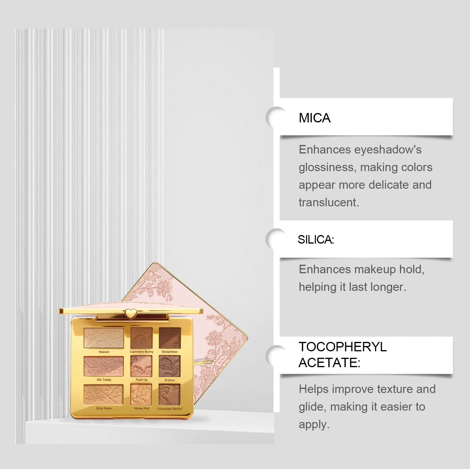 - Oversized base shades ensure you don't run out of your most used shadows
